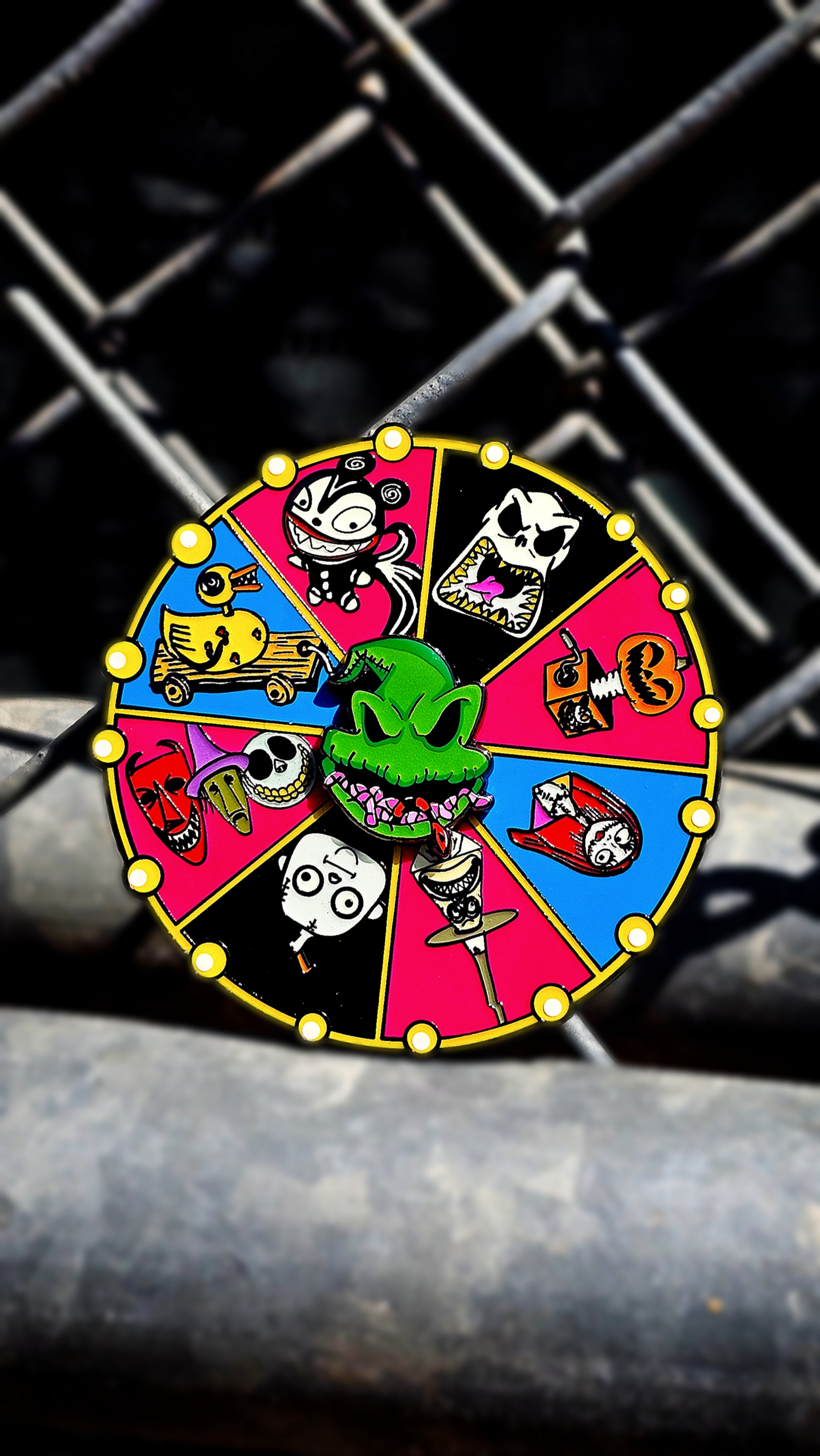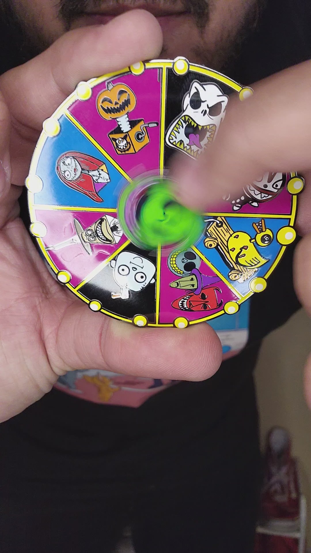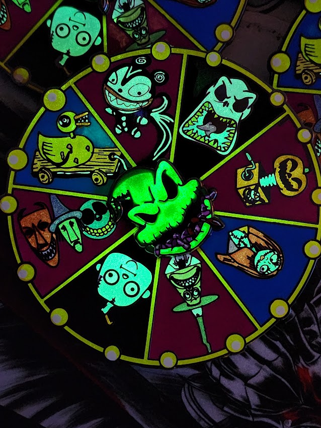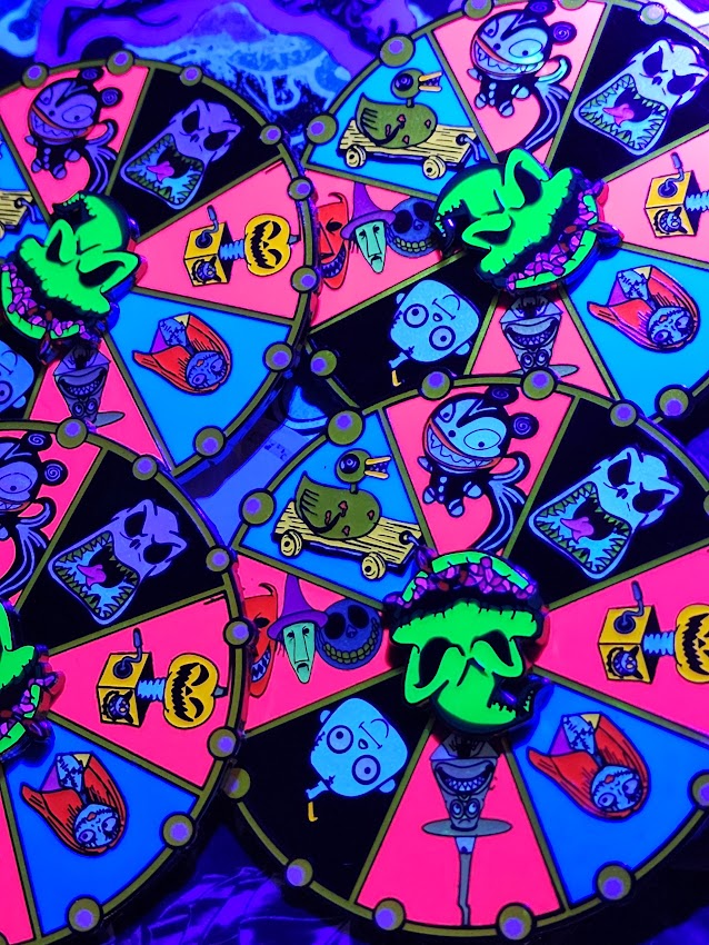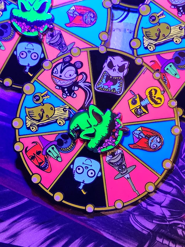 3 inch roulette table that spins w/ glow in the dark. Illuminate your style with this luminous enamel pin of the infamous Boogie Roulette Table from the beloved Nightmare Before Christmas. Featuring Oogie Boogie and his signature spinning Roulette Table, this pin is sure to capture the magic of the season. Make your holiday accessories glow with this one-of-a-kind enamel pin!