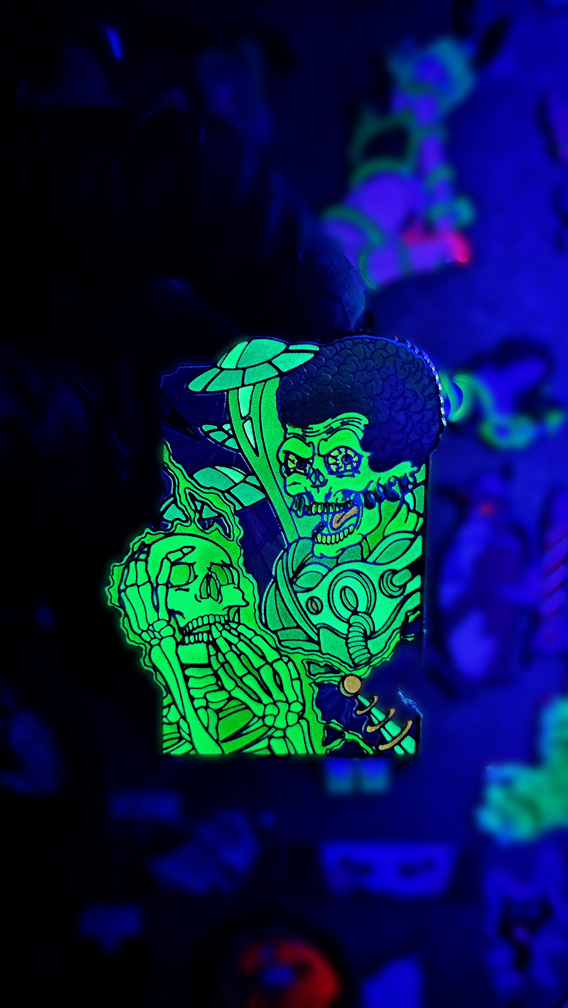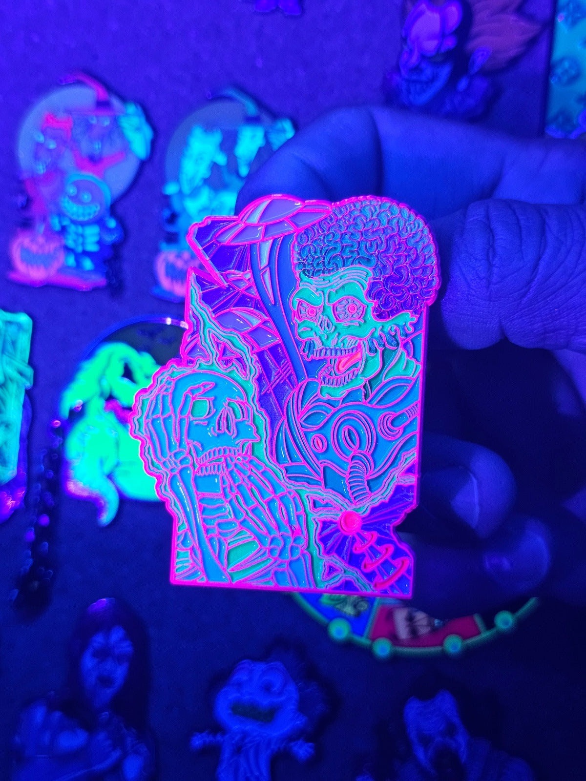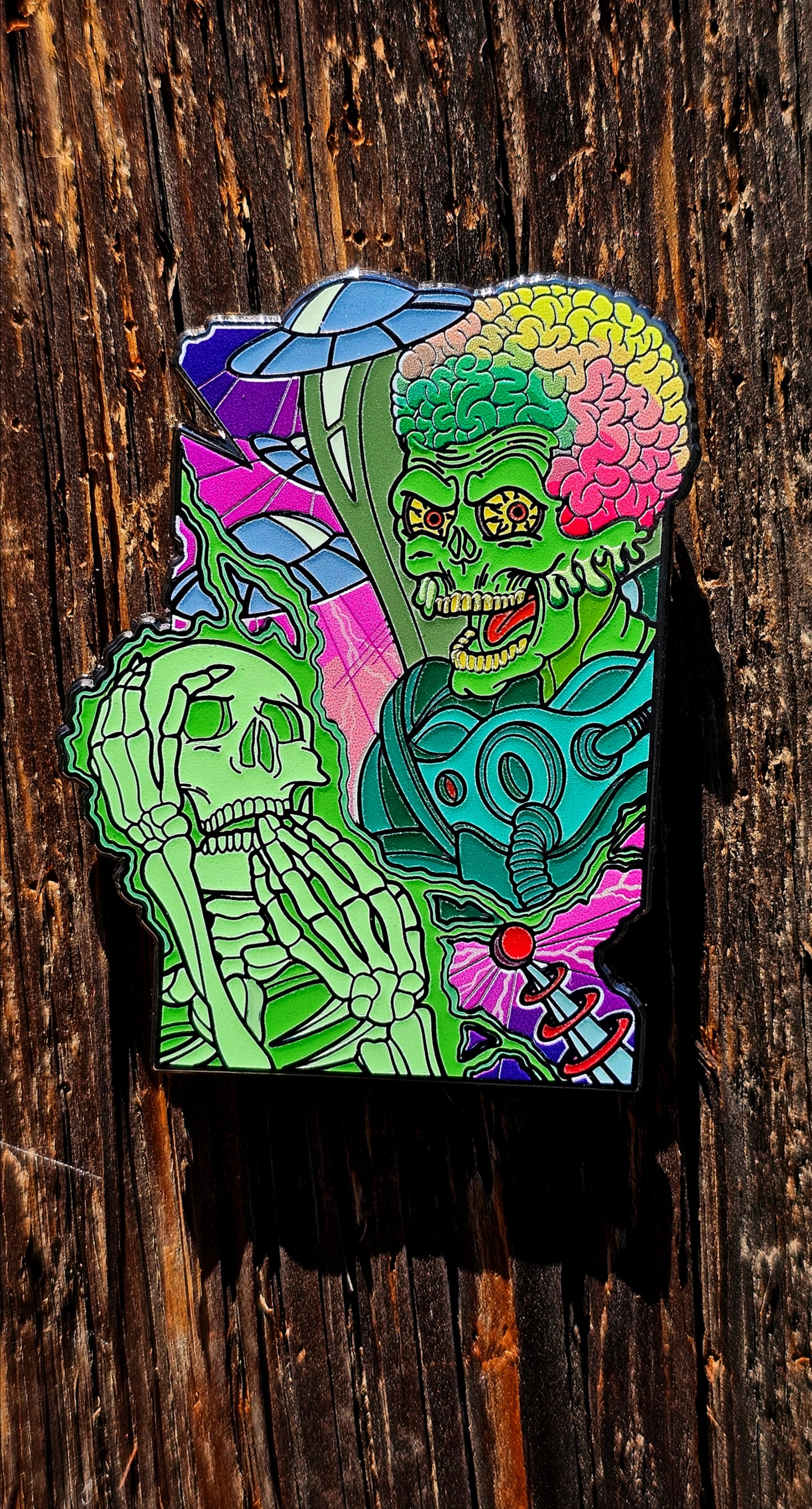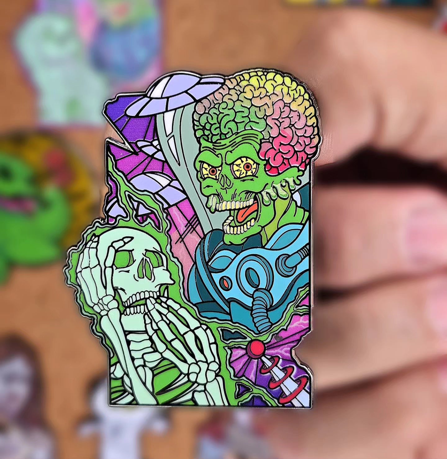 Introducing the Mars Ack Enamel Pin - perfect for fans of the classic horror movie. In two varieties of hard and soft enamel, this pin features a Mars attack and big brain alien design, sure to bring an extra dose of fear to your wardrobe! 🤭