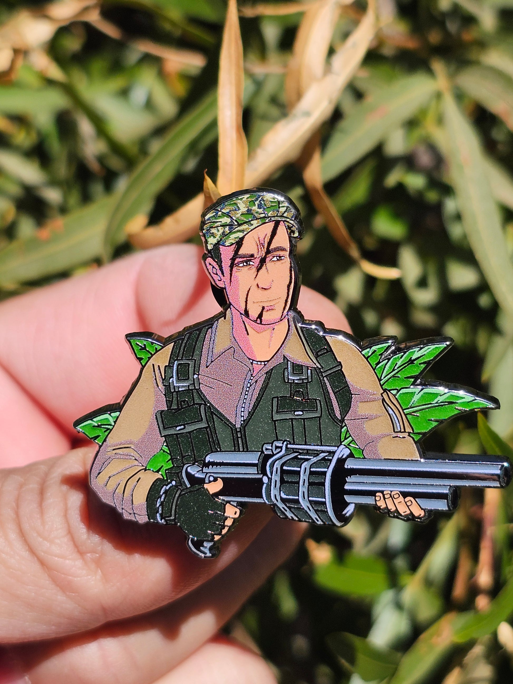 Wear the iconic poncho from the sci-fi movie Hunter with pride! This 2 inch enamel pin, specially produced for Mr. Richard Chaves, glows in the dark for added coolness. Show off your love for the film and make a statement with this must-have collector's item.