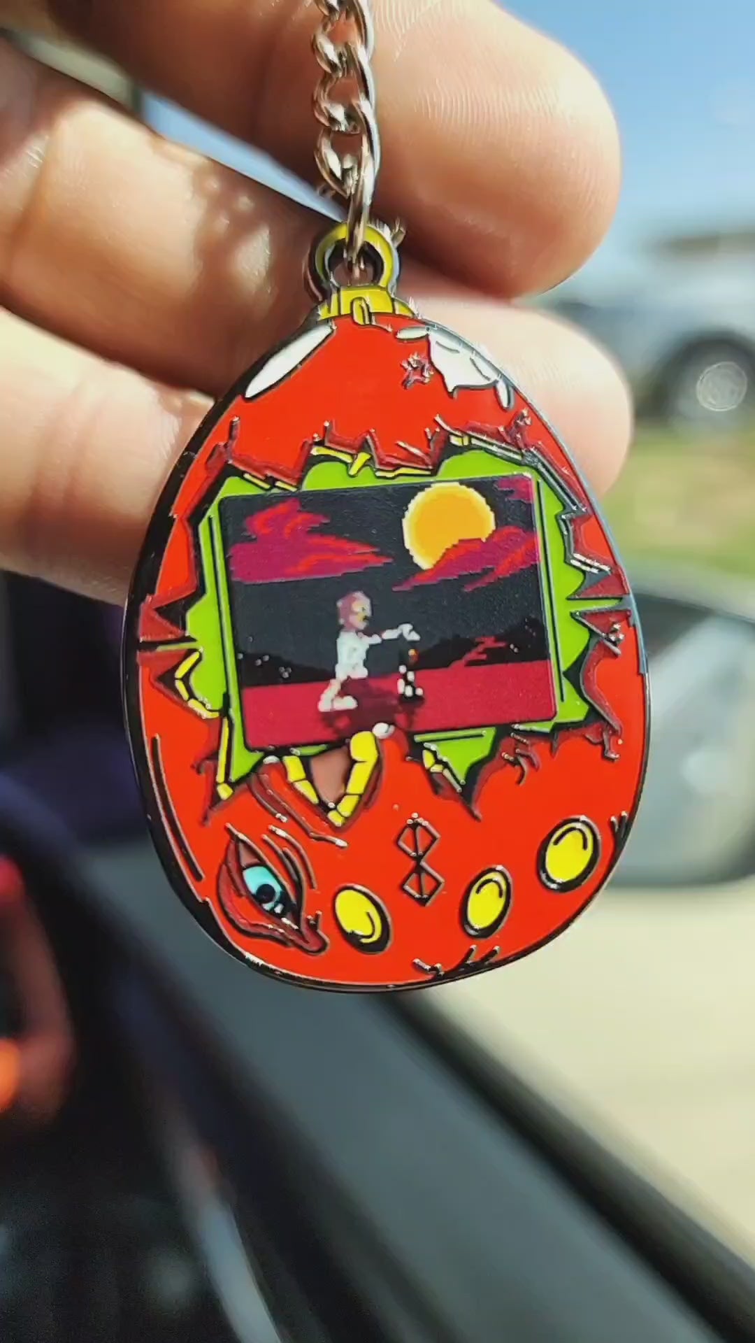 Multiple variants 2 inch hard enamel w/ screenprint design and keychain attachment.
