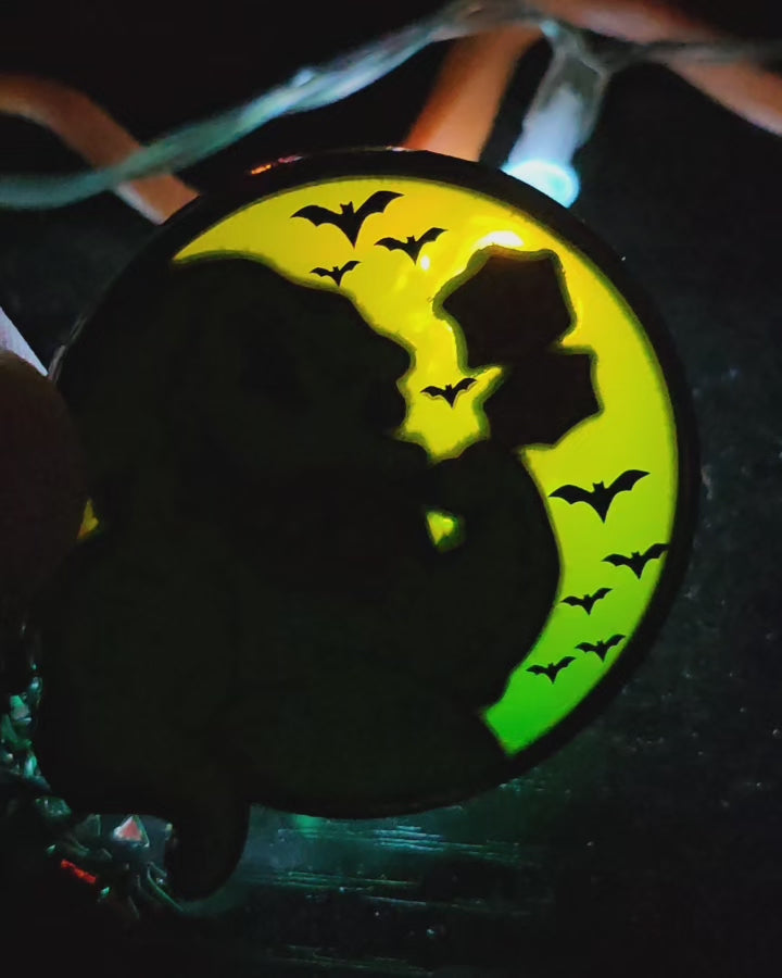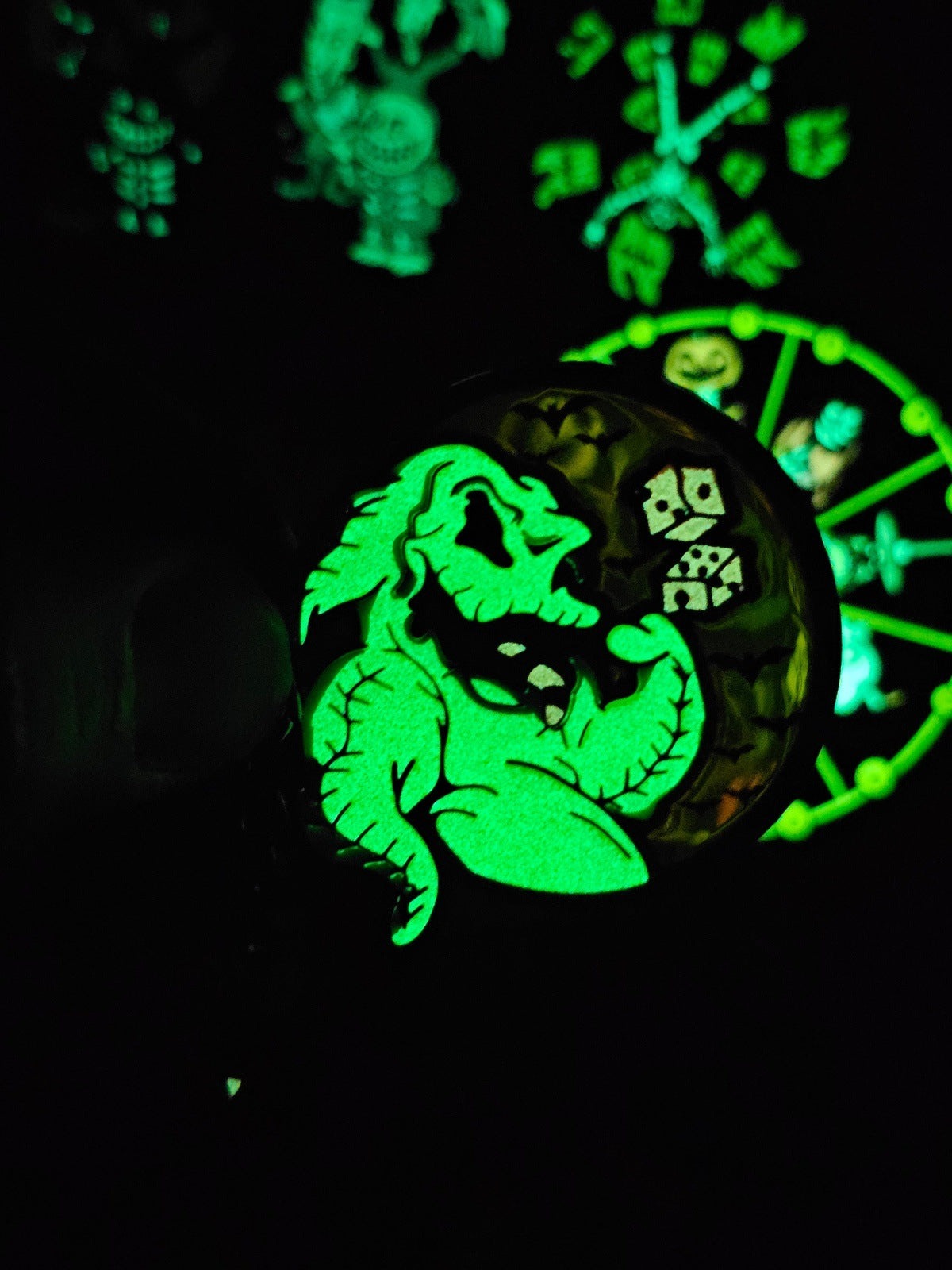 Feel the magic with this limited edition What do we have here Boogie enamel pin! Its Oogie boogie figure comes alive with a special transparent glass detail, a dangling chain with a spider charm, and it even glows in the dark 🌃!! A perfect addition to any fan's collection 🤩.