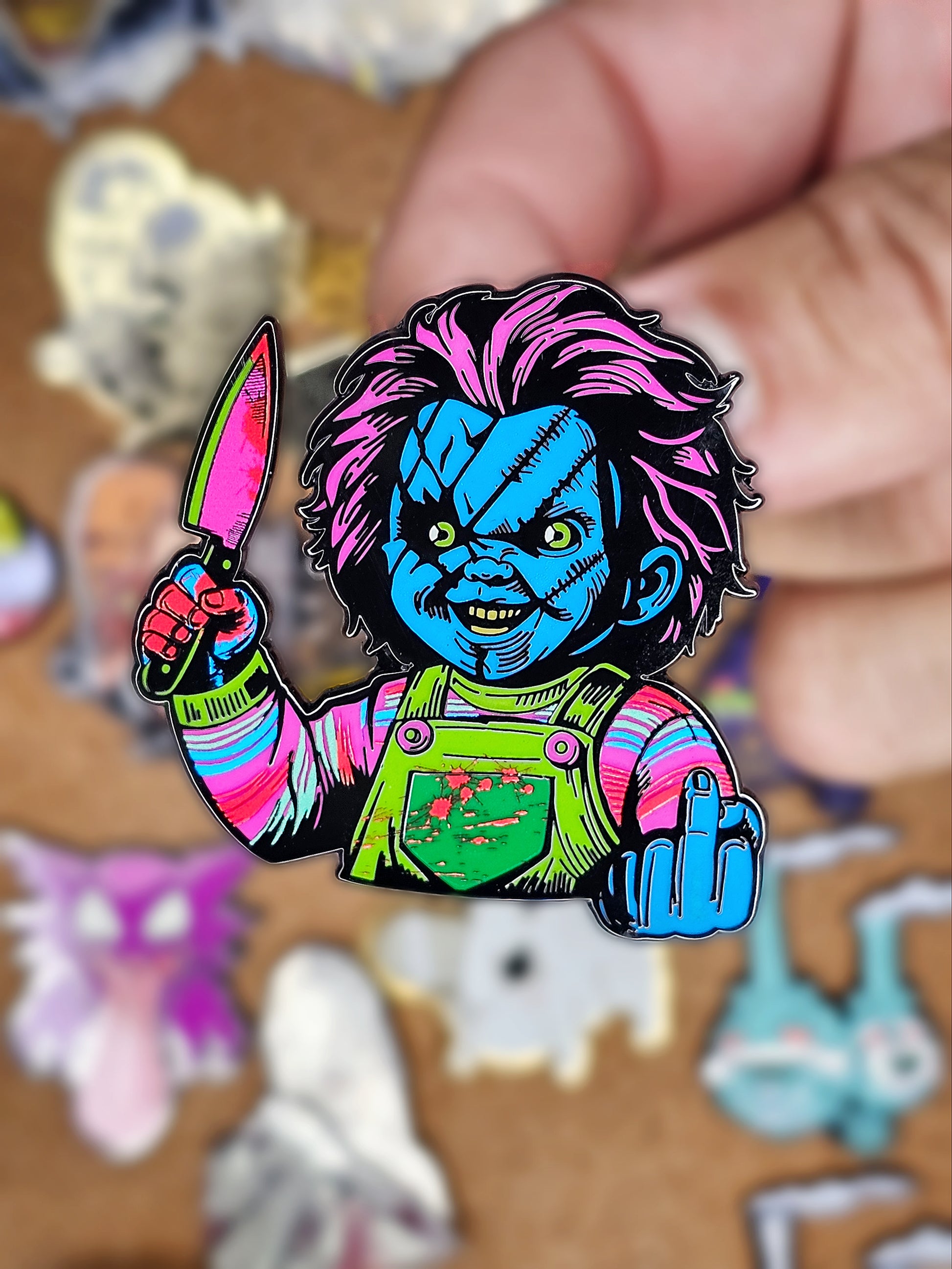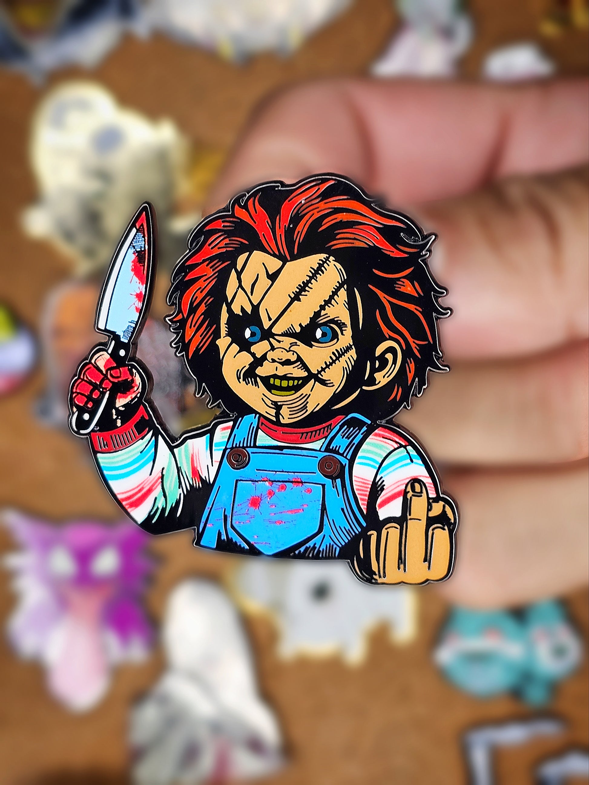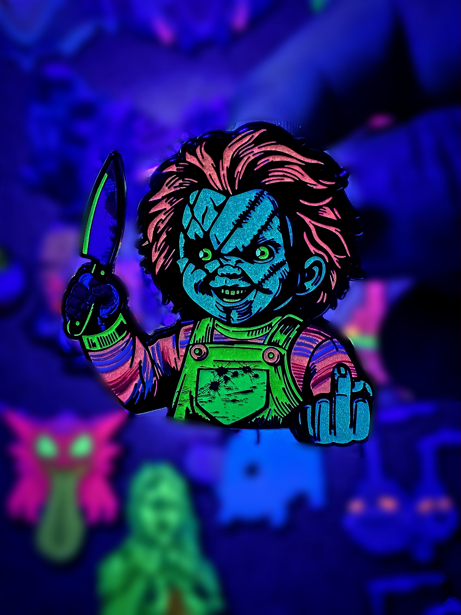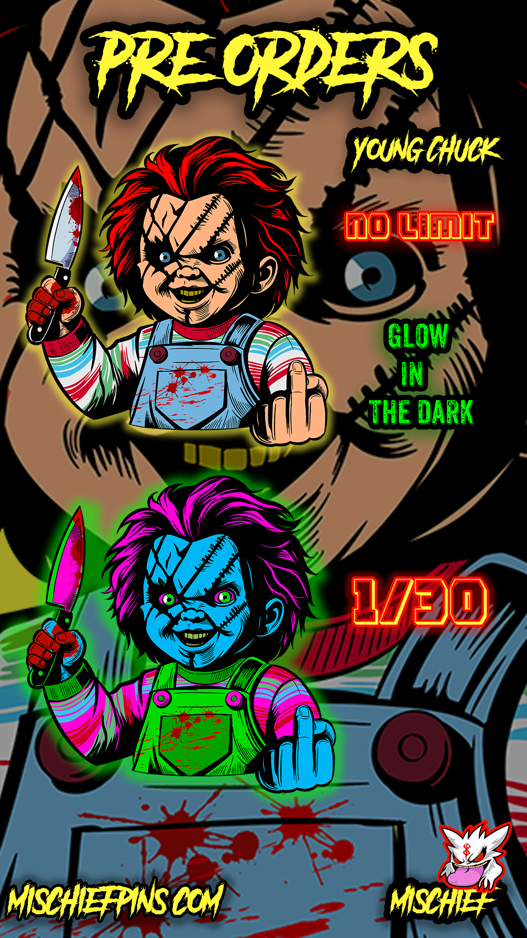 Unleash your inner horror fan with the Young Chuck Middle Finger PRE ORDERS! This iconic slasher from your favorite movies is now available as a 2 inch hard enamel pin, with 2 eye-catching variants and a glow in the dark feature. Perfect for any horror lover, pre-order yours now!